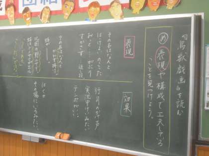 11月20日(金)6年生は,国語の学習で,『「鳥獣戯画」を読む』という学習をしています。数ヶ月前,京都国立博物館では,全面修理を終えた「鳥獣戯画」が公開されていました。もともと,表裏に書かれていた絵をはがして,つなげたものであることなどが新たにわかり,話題になっていました。そんなタイムリーな題材も,教科書で学習しています。1組は,2時間目。2組は,3時間目に学習しました。