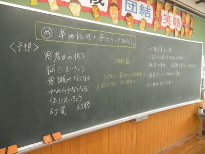 11月24日(火)6年1組の保健では,「薬物の乱用」について学習しました。メディアの報道にもありましたように,小学生も大麻を使用したという事件が,学校関係者を驚かせています。子どもたちに正しい知識と,誘われた時の断り方を身につけてほしいと願っています。