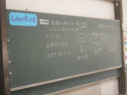 1月12日(火)5年1組の理科は,「物の溶け方」について,学習しました。塩や砂糖は,水に溶けるとなくなってしまうのかと言うことを考えました。