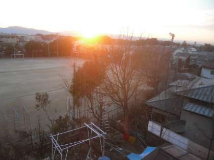 きれいな朝日が7時15分頃見られました。朝日の光は,校舎を照らし,その向こうの仁和寺の山門も照らしていました。