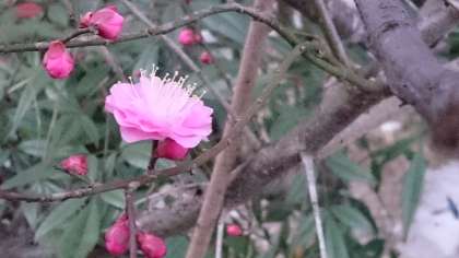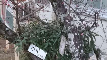 御室小学校の正門を入って右手の掲示板の手前に,梅の木が2本あります。その梅の花が咲き始めています。例年より,大分早いのですが,これから寒くなるのに,寒くなる前に梅が咲き始めたような感じです。