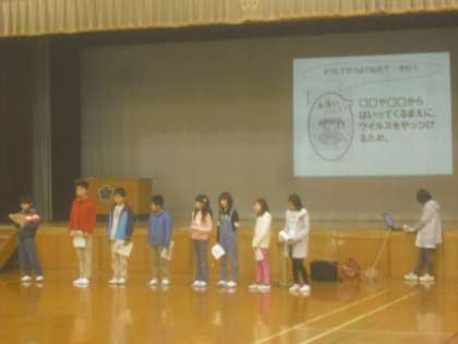 オムロワールドの保健委員会の発表は,インフルエンザの予防についてです。クイズを出しながら,インフルエンザの予防について,みんなに考えてもらいました。