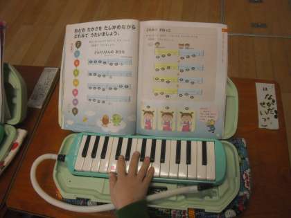 1月19日(火)1年1組の音楽では,鍵盤ハーモニカの練習をしました。指使いに注意して演奏しました。