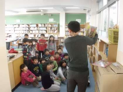 きれいに整理された図書室で,担任の先生に1年生が読み聞かせをしてもらっていました。