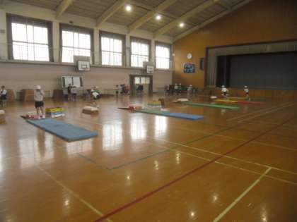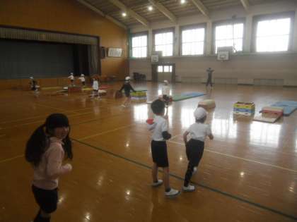2月12日(金)1年2組の体育は,跳び箱をしました。みんな頑張って跳んだ後,ポーズを決めていました。