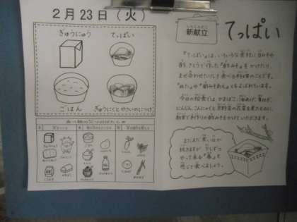 2月23日(火)の給食は,新献立で,「てっぱい」が出ました。