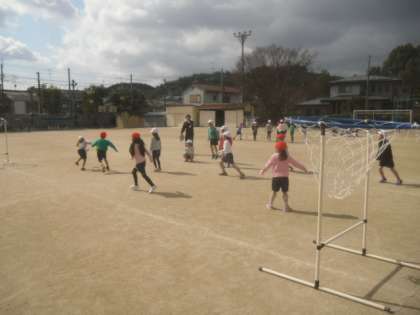 運動場で,パスゲームをしました。