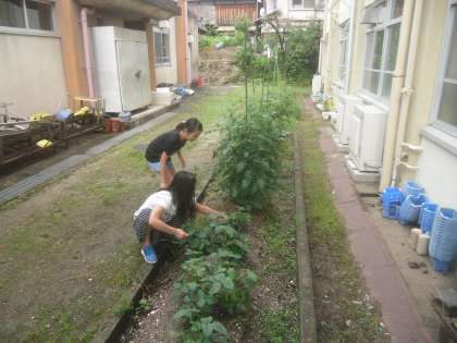 6月17日(金)6年が,地域ボランティアの方々にお世話になって,育てている夏野菜の収穫が,始まっています。