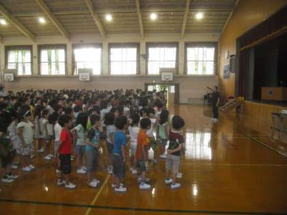 7月4日(月)朝会の後,オムロソングの練習をしました。