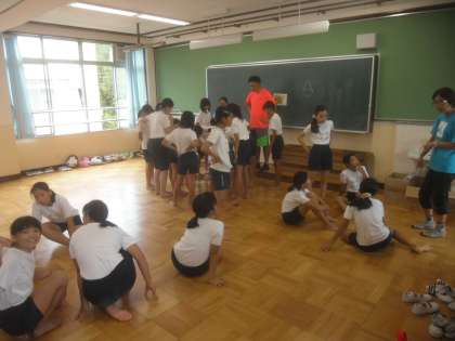 男子と女子に別れて,タワーの練習を教室の中でしました。