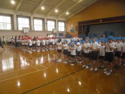 あいにく雨が降って,運動場の状態が悪かったので,体育館で行いました。