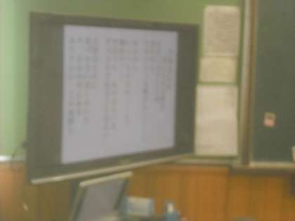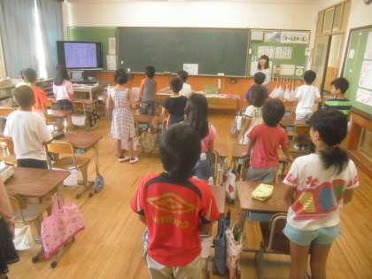 コンピュータとテレビを使って,音楽が流れて,画面に歌詞が出ます。