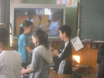 コンピュータとテレビを使って,見本を見ながら,ちょっとした体操ゲームを行います。