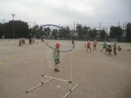チームでパスをしながら,ゴールにボールを入れることを目指します。