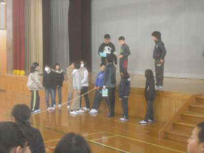 体育館の真ん中にロープをはって,移動しながら,○×クイズをしました。