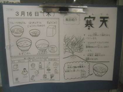 ほうれん草とじゃこの炒め物と,フルーツ寒天も出ました。
