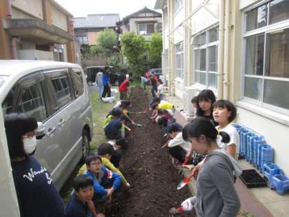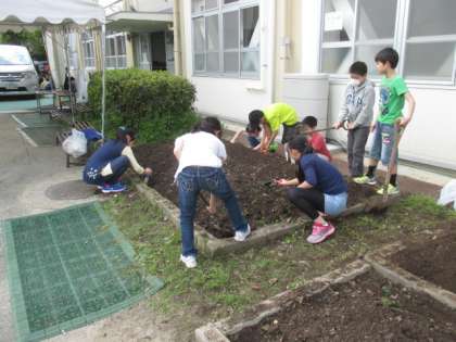 4月19日(水)6年せいが,総合的な学習の時間で,「土作り」をしました。