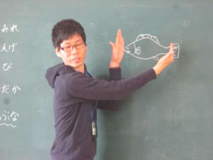 「こぶなつりし,かの川」という説明で,フナの絵を描いて説明しました。