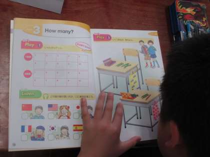 教材の本に描いてある文房具などの数を覚えて,答えていました。