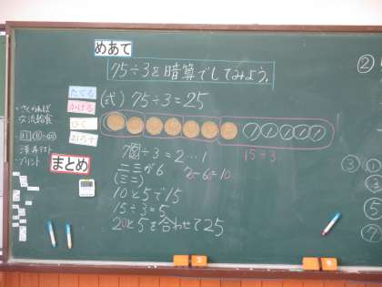 75÷3を10円玉と1円玉で意味を考えながら,暗算の仕方を考えました。