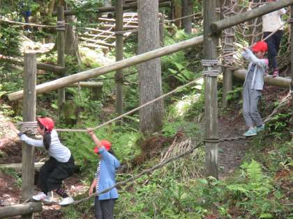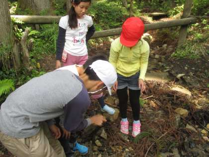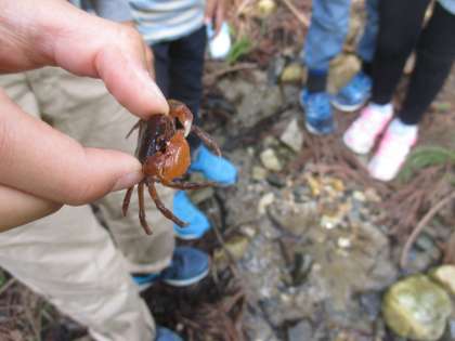 アスレチックの最中、川に下りたり、魚やカニを探したりもしました。