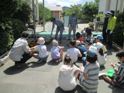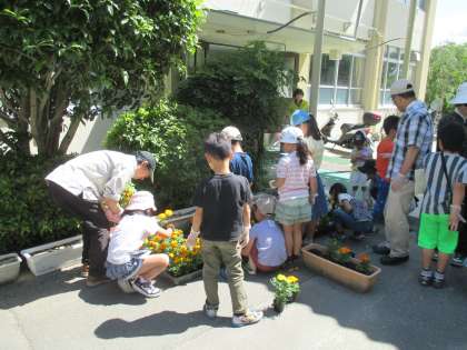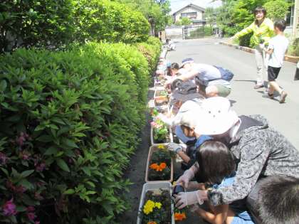 やさしく地域の指導者の方に教えてもらって,とても楽しそうに花の苗を植えています。