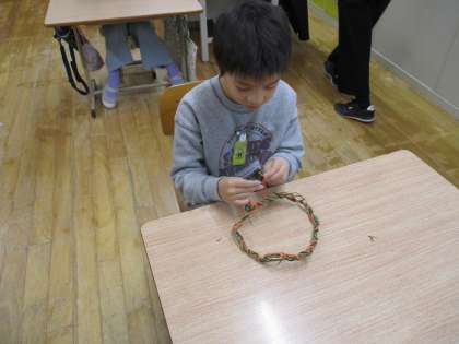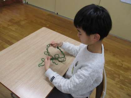 3組で収穫したサツマイモのツルを使って、リースを作りました。リボンや綿などの飾りをボンドで付けたり、折り紙で作った飾りを付けたり、それぞれに工夫をしながら楽しんで作ることができました。大きなまつぼっくりを使ってツリーも作りました。