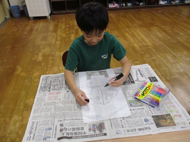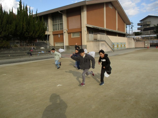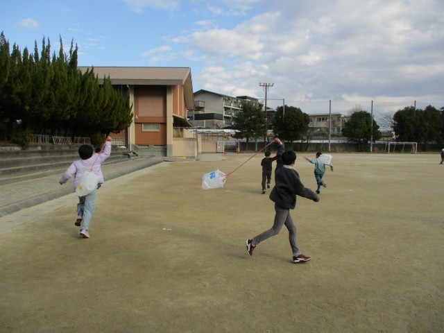 生活単元学習で色々なお正月遊びに親しんでいます。今回はみんなで凧揚げをしました。自分でビニル袋に絵を描き、オリジナルの凧ができました。凧があがるように、運動場を思いっきり走る子どもたち。とても寒い日でしたが、「暑い」と言う子もいるほど元気いっぱい体を動かして楽しみました。