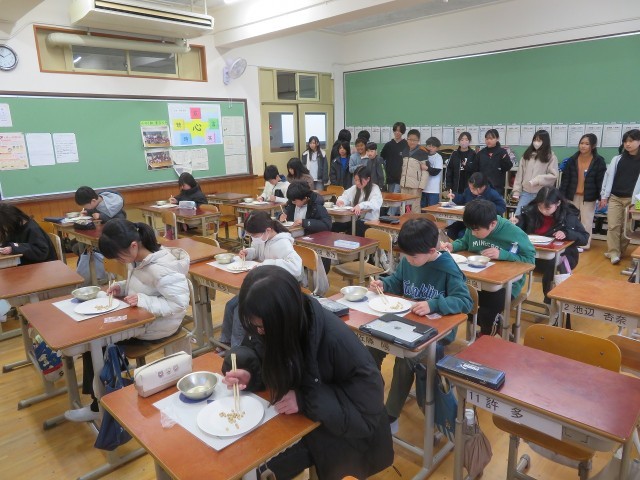 給食週間の取り組みで、「豆つまみ大会」を行いました。箸の使い方に気を付けながら、前半と後半に分かれて、30秒間集中して取り組むことができました。