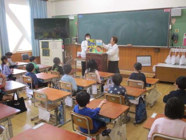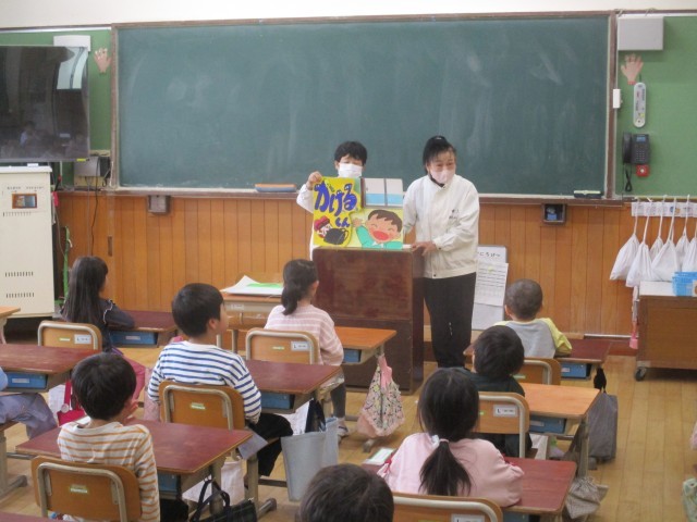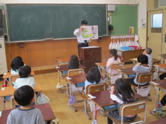 右京警察署交通課、御室交通安全推進会、右京交通安全婦人部の皆様にお越しいただき、紙芝居などを使って交通安全についてのお話をしていただきました。