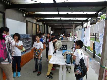 2日目の朝です。蒸し暑いのでたくさん水分をとり、熱中症にならないように心がけています。朝のつどいでは宇多野の学校紹介をしっかり話していました。
