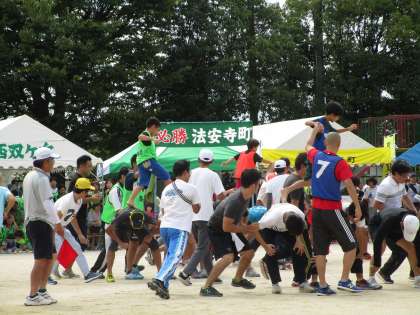 24日(日)に宇多野学区民体育祭が行われました。大勢の参加で町内対抗で盛り上がっていました。背中渡り競争もチームワークでがんばっておられました。