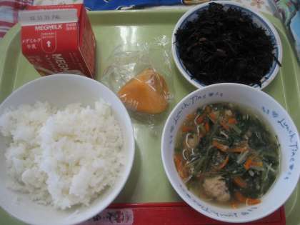 11月9日の給食は「ごはん、牛乳、水菜とつみれのはりはりなべ、ひじきの煮つけ、柿」です。水菜は京都府産のものです。やわらかくてみずみずしくシャキシャキした歯ざわりが特徴です。つみれはツナ缶と鶏ミンチ、しょうが、細ねぎをよく混ぜて丸いつみれにしました。このつみれを削り節のだし汁で煮て仕上げに水菜を加えて鍋風にしました。子ども達も「つみれがおいしい。水菜はシャキシャキしている。」と好評でした。ひじきの煮つけもごはんが進んでおかずもごはんもしっかり食べられた一日でした。