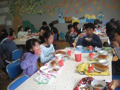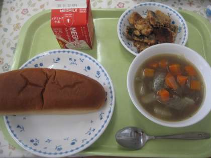 11月10日の給食の給食は「黒糖コッペパン、牛乳、いわしのからあげ、ポトフ」です。ポトフはフランスの煮込み料理で日本のおでんのようなものです。肉と野菜をコトコトとよく煮込んで、そのうま味がスープの中に出ています。肉は牛角切り肉、野菜はたまねぎ、にんじん、かぶら、白ねぎです。今日のかぶらは京都府内産です。いわしのからあげも生姜醤油に漬けたいわしの切り身に粉をつけて油で揚げました。子ども達は「いわしがおいしい。いわしがからっとしている。ポトフのお肉がおいしい。」という感想を言っていました。
