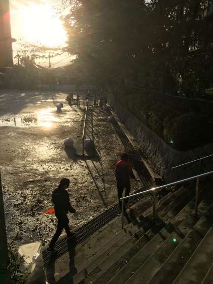 台風21号が去って,枝や葉,木の実などで学校の敷地が全面覆われました。放課後に教職員総出で清掃をしました。明日は元の学校の様子に戻っているので,子どもたちがびっくりするかもしれません。一人の力は小さいけれど,みんなで行えば大きな力になります。教職員もこうして力を合わせていますよ。