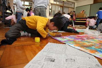 全紙大の画用紙2枚分に,空き容器や野菜の切れ端などの身辺材を版にして写しだしたり,ローラーを使って線を描いたりする造形遊びをしました。どのグループも時間が経つにつれ,手や足に絵の具をつけてのダイナミックな活動になっていきました。30分程度の活動で,全紙大2枚分がほぼカラフルな模様や線で埋め尽くされました。子どもたちはとても楽しんで活動することができました。
