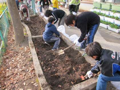 園芸委員会の子ども達が今日はスコップやシャベルをもって土運びに挑戦です。