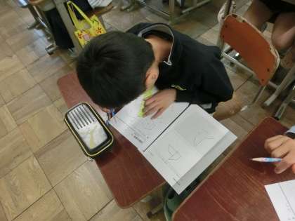 算数の学習で対称な図形について学習しています。対称には,「線対称」と「点対称」があり,それぞれに性質があることを学習しました。今回は,点対称な図形を描くことに取り組んでいます。線対称ではすんなりと描けた子が多かったのですが,点対称はどんな形になるのかを考えたり,対応する点を見つけたりするのが難しかったようです。友達とアドバイスをしあいながら描いていました。