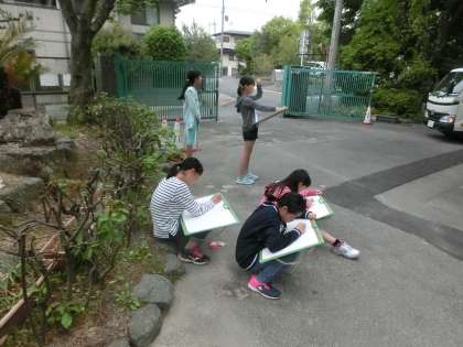 図画工作科の題材で「わたしの大切な風景」に取り組んでいます。思い出のつまった学校の中でも特に心に残っている場所を選んでスケッチしています。今回は奥行のある構図にチャレンジしています。対象をよく見てじっくりと描いています。普段何気なく歩いている校内ですが,改めてじっくりとみるといろいろな発見があったようです。