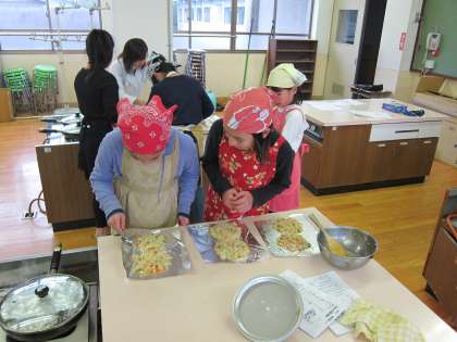 12月16日に「健康教室〜しっかり食べておいしくからだにやさしいクッキング〜」を行いました。参加者は子ども達、保護者、教職員合わせて27人でした。みんなでわきあいあいと3品を仕上ました。一つめは「ごはんのお好み焼き」です。ごはんにじゃこやねぎにんじんなど色々な具を混ぜて卵をつなぎにしてお好み焼きのように焼きます。二つ目は中身がお楽しみの「ホイル焼き」です。キャベツやかぼちゃ、しめじなどをホイルに包んで、焼きました。野菜そのものの味が味わえて、子ども達も「野菜がとっても甘い。」と言いながら食べていました。三つ目はホットケーキミックスを使って、りんごの甘煮を入れた「りんごのホットケーキ」です。フライパンにクッキングシートを敷いて簡単にできます。子どもの食事量は成長とともに変わることや食事の中身を色々な食材を使うことの大切さを学習しました。