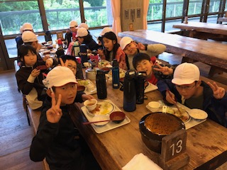 1日目の夕食です。食堂でもりもり食べています。この後,お楽しみのナイトハイクです。