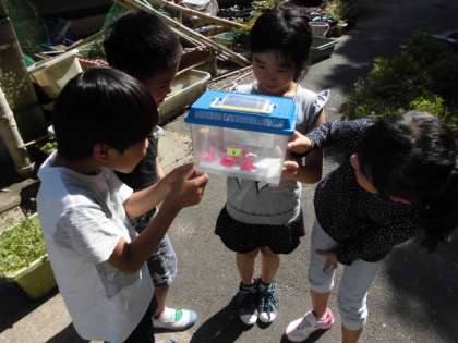 毎日お世話をして観察していたアオムシが,今朝モンシロチョウになりました!小さなアオムシから蛹になり,蛹の中に蝶の模様が見えてきて・・・と毎日ワクワクして見ていました。「もうお世話できなくなるのは寂しいけど,モンシロチョウになって嬉しい。」と少し名残惜しそうに,飛びたつモンシロチョウに手をふっていました。さて,他の蛹もそろそろ・・!