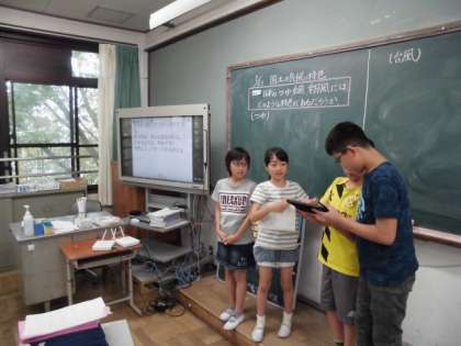 タブレットを使って梅雨・台風・季節風の特色をまとめて交流しました。どのグループも上手にまとめており分かりやすかったです。