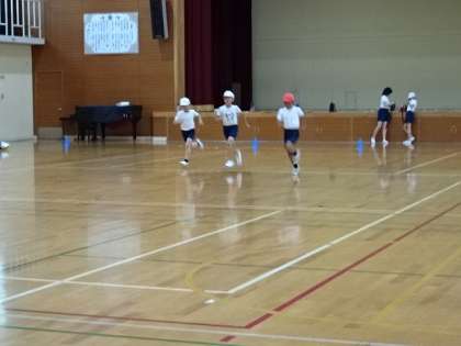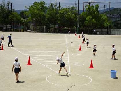 子どもたちはソフトボール投げやシャトルランなど,体力テストに一生懸命取り組んでいます。周りの子どもたちも応援したり手伝ったりして,いい雰囲気です。