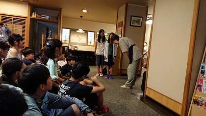 今日宿泊する「なごや花亭みよし」に着きました。到着式をしています。みんな元気です!