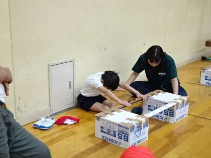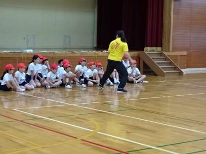 長座体前屈,反復横跳びです。説明をしっかりと聞いて協力し合って取り組んでいます。