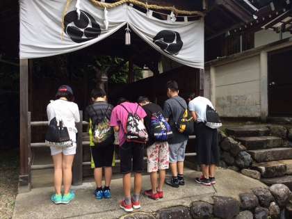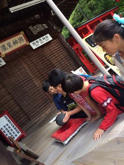 近くに神社もあるので散策しました。「おもかる石」で願いが叶うかどうか願いながら持っていました。