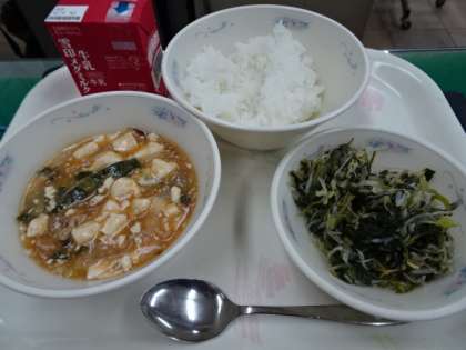 今日の給食は,「ごはん 牛乳 とうふの四川風 ほうれん草ともやしのいためナムル」です。
