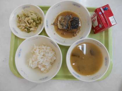 さばの梅煮はしょうがと梅干を入れて煮ました。魚のにおいが和らいでさっぱりと食べられます。さばは全体に味が染みるように,煮汁をかけながらコトコトと煮ました。