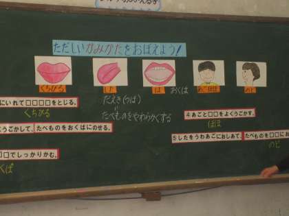 まず、食べ物がどのような経路を通って体の中に入るのかを確認しました。今まで当たり前のように食べていましたが、一つ一つ確認することで、「かむ」とはどういうことなのかを改めて知ることができました。くちびるを閉じて、舌の上に食べ物をのせ、奥歯で噛み砕き、唾液とよくまぜあわせて十分やわらかくしてから飲み込むことを教えてもらい、実際に乾パンで、確かめました。